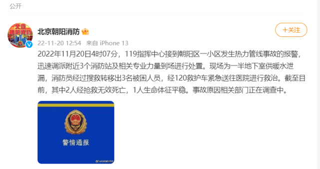 @北京朝阳消防 通报,11月20日4时07分,119指挥中心接到朝阳区一小区发生热力管线事故的报警,迅速调派附近3个消防站及相关专业力量到场进行处置。现场为一半地下室供暖水泄漏,消防员经过搜救转移出3名被困人员,经120救护车紧急送往医院进行救治。截至目前,其中2人经抢救无效死亡,1人生命体征平稳。事故原因相关部门正在调查中。