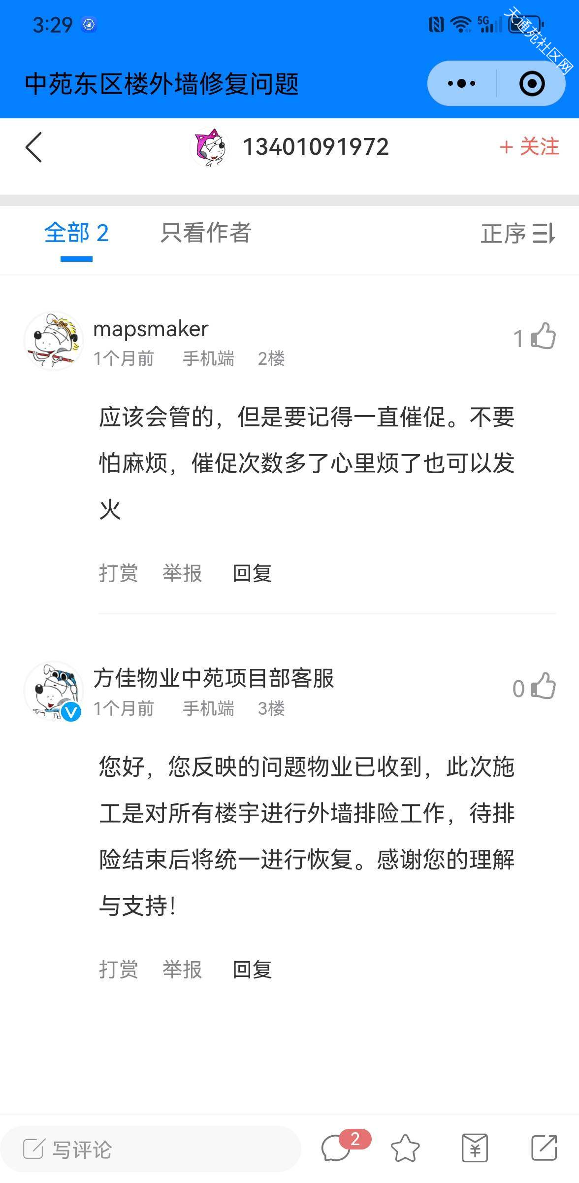 9月上旬物业对中苑东区外墙进行了处理,把有问题的地方铲除了,见下图,铲除后截至目前还是没下文了,我于9月下旬在论坛发帖问过一次物业,物业回复见下图,现已11月份了,请问物业后续何时修补,能否给出具体时间?