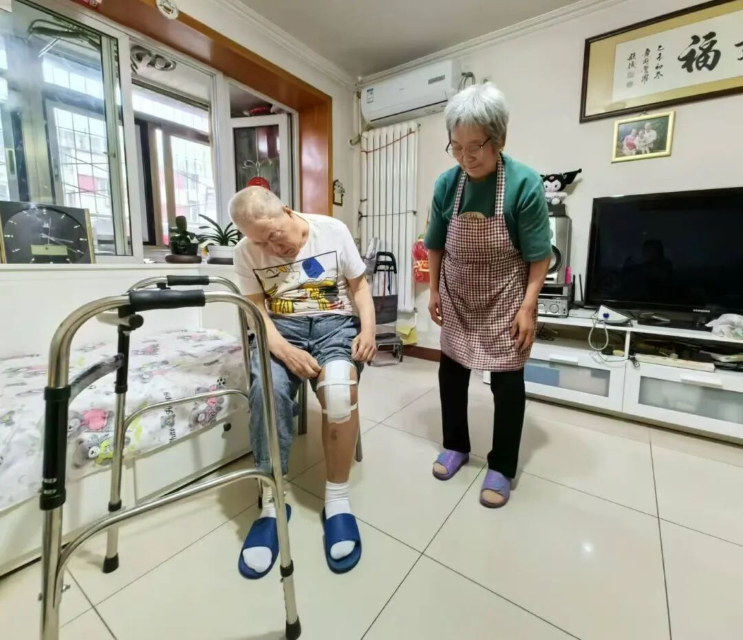 今年77岁的李鑫民老人家住四层,曾为该部电梯的安装奔走呼吁,如今电梯停运,老人已很难出门。一听记者提到电梯,老人从床上吃力爬起,一步步挪着助行器将记者迎进客厅。李先生的老伴拉起他的裤腿,只见膝盖处缠着白纱布,“他刚做手术换了膝关节。”其老伴一边说着,一边拉起自己的裤腿,“你看我这腿粗的,关节炎,走路都困难,更别说爬楼了。”记者看到,李鑫民的腿部肿胀、黑紫,其老伴的左腿明显比右腿肿了一圈。