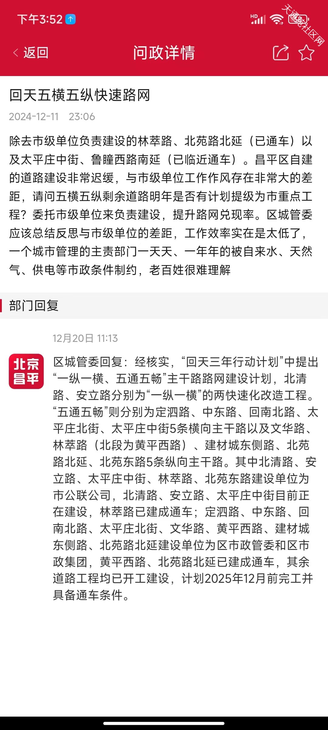 区城管委回复:经核实,“回天三年行动计划”中提出“一纵一横、五通五畅”主干路路网建设计划,北清路、安立路分别为“一纵一横”的两快速化改造工程。“五通五畅”则分别为定泗路、中东路、回南北路、太平庄北街、太平庄中街5条横向主干路以及文华路、林萃路(北段为黄平西路)、建材城东侧路、北苑路北延、北苑东路5条纵向主干路。其中北清路、安立路、太平庄中街、林萃路、北苑东路建设单位为市公联公司,北清路、安立路、太平庄中街目前正在建设,林萃路已建成通车;定泗路、中东路、回南北路、太平庄北街、文华路、黄平西路、建材城东侧路、北苑路北延建设单位为区市政管委和区市政集团,黄平西路、北苑路北延已建成通车,其余道路工程均已开工建设,计划2025年12月前完工并具备通车条件。