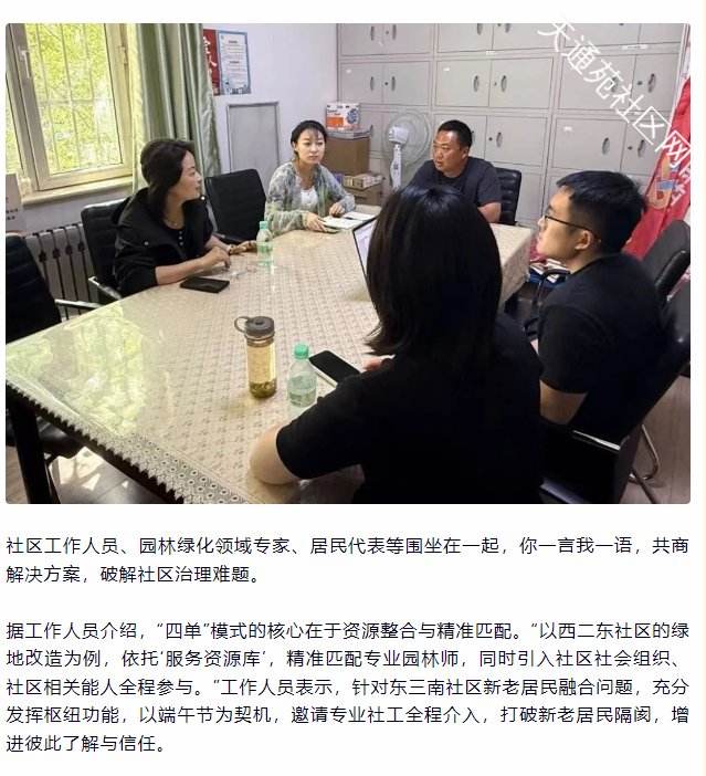 近日,天北街道社工中心通过“居民点单—社工派单—中心接单—群众评单”的“四单模式”,高效解决社区难题,以精准化、专业化服务推动构建共建共治共享的社会治理新格局。