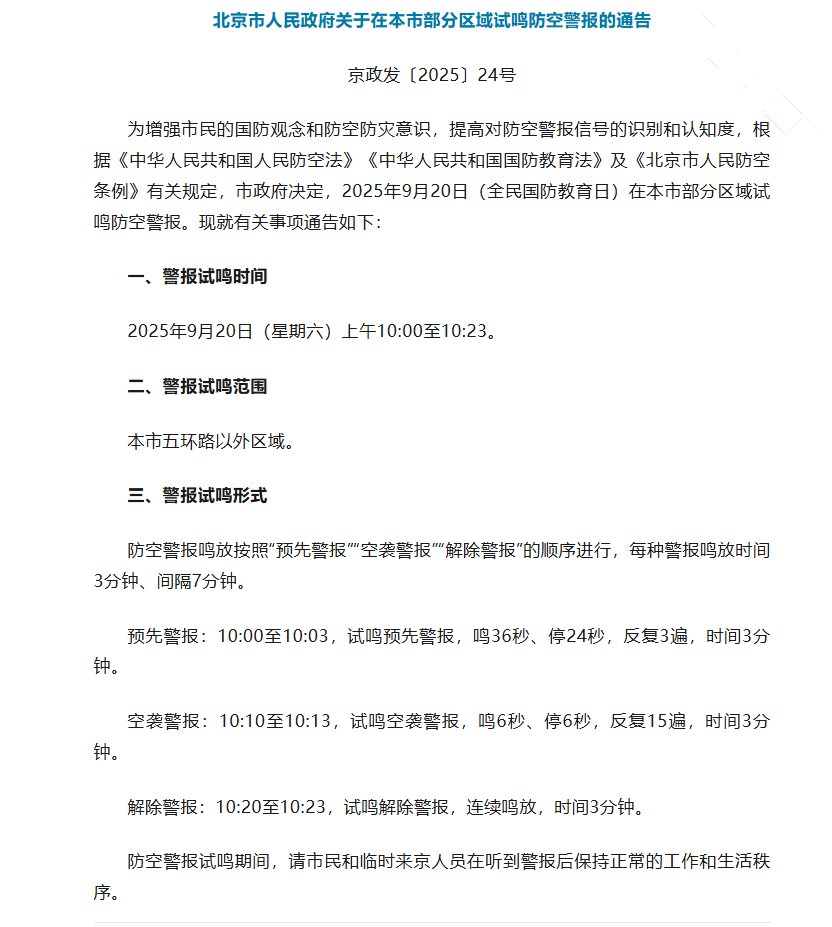 按照《北京市2025年防空警报试鸣实施方案》的工作要求,2025年9月20日(全民国防教育日)