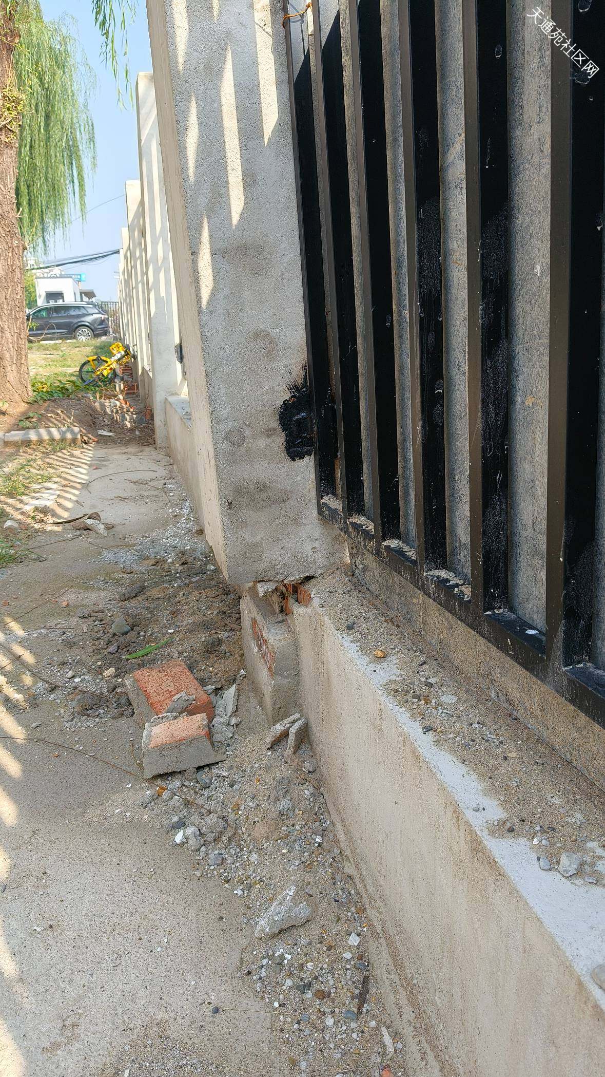 东二北社区新修的围墙,由于北苑东路施工方堆物堆料的挤压,造成部分围墙向西大幅度倾斜,有倒塌风险,请尽快修复