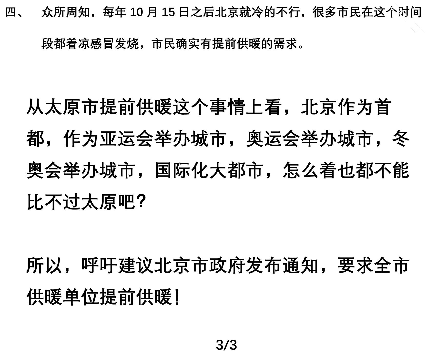 再次建议,不知有无北京市人大代表愿意在北京市人大提出方案:根据北京市广大市民的强烈要求,和北京市现在已经能够满足的供暖条件,将北京市供暖时间固定在每年11月1日到第二年3月31日。如果某年气候变暖,可已临时缩短供暖时间