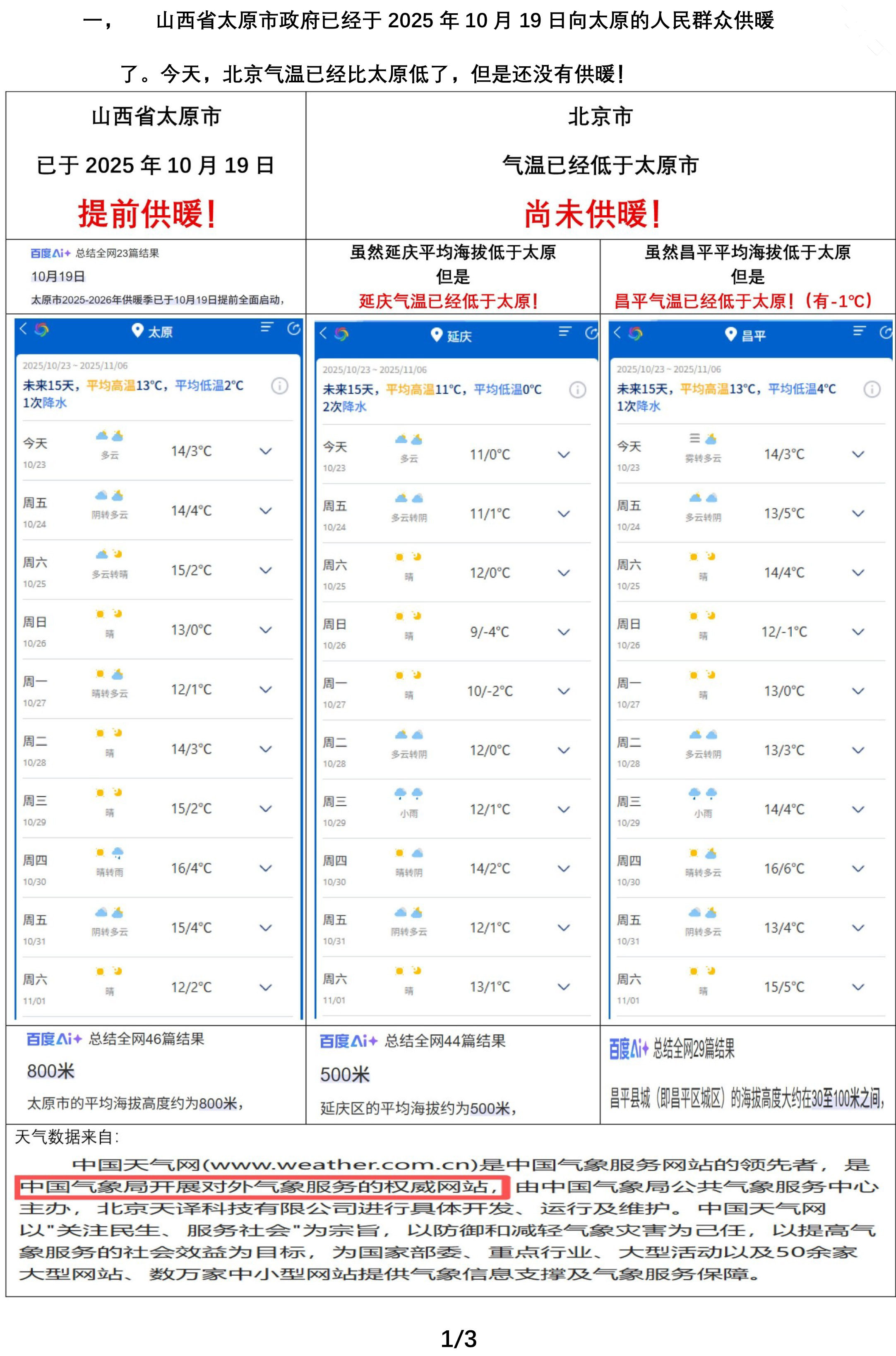确实,我听老家太原的人说都供暖了好几天了,我还说太原在北京南边咋都已经供暖了,北京能不能先晚上供一点让室温高于 20 度,白天气温上来了再停,我记得每年到 3 月的时候就这样,白天凉晚上热
