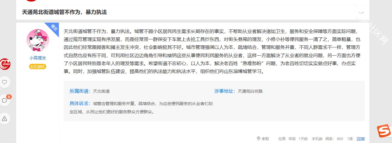 12345投诉板块里还有个占道理发说城管不合理的