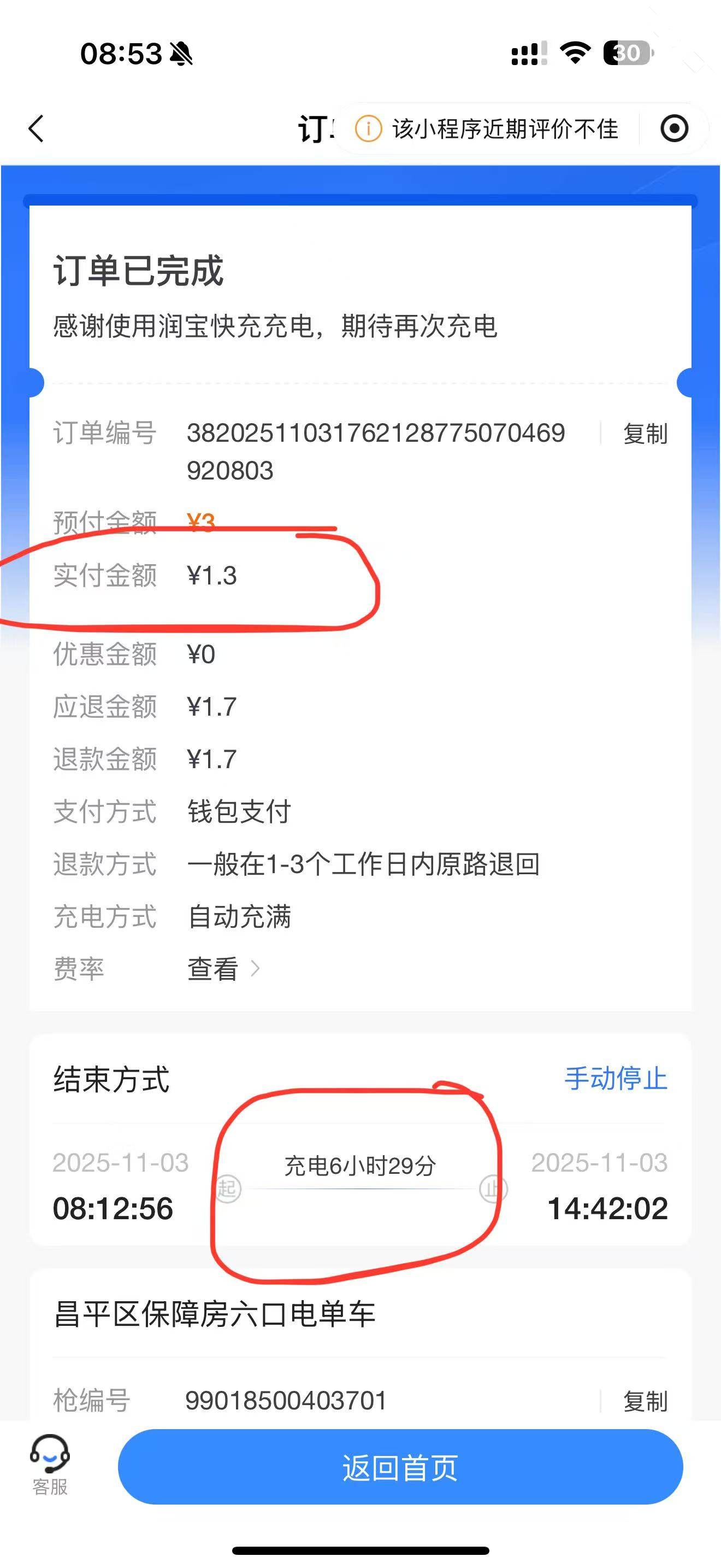 同事跟我说咱这边保障房的便宜,就去试了一下。同样是我自己的小牛M1,电池48V26ah,用的我的快一些的充电器,插了6个半小时,正常情况我这个5个小时完全可以充满。保障房这边消费1.3元。而我自己住的中苑那价格就高的离谱了。实际保障房的这个电费价格和服务费价格也已经比我北七家同事家那边高出来将近一半,但相比我们天通苑其他区的充电价格那也已经是非常实惠了。