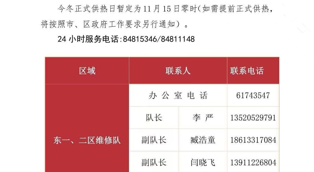 各位业主,家中暖气不热或出现跑冒滴漏等现象,请及时联系天阳供暖公司处理,以免造成不必要的损失。