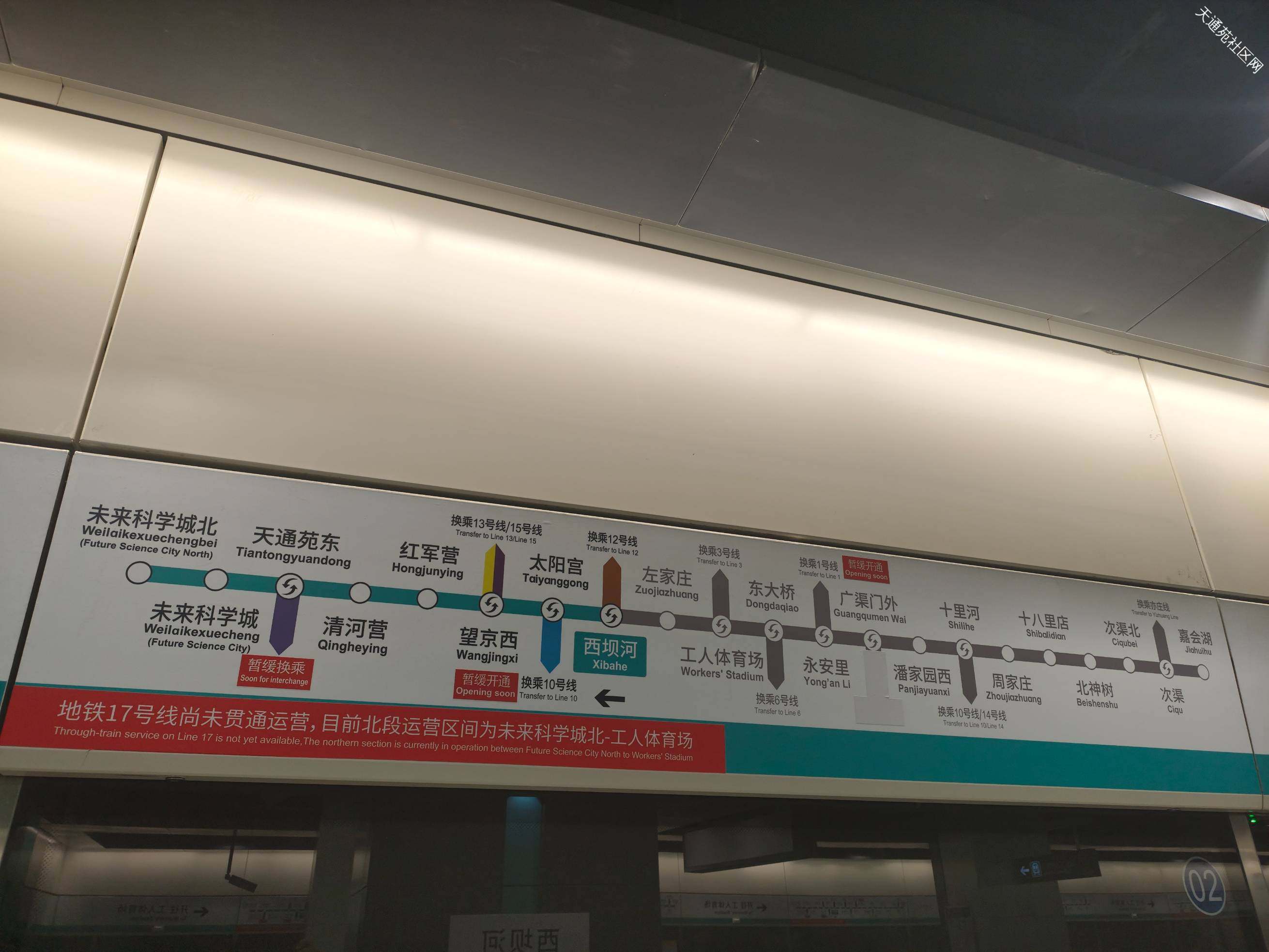 昨天晚上乘坐17号线回家,看到西坝河站已经更换了站点标识,已经改成了“未来科学城北至嘉会湖”,但先注明了“未全通车,只到工体”,但离全线开通不远了。