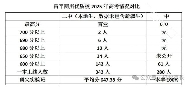 昌平二中,今年是真的杀疯了。在2025年北京高考的大盘中,昌平二中交出了一张几乎可以称为历史性突破的成绩单:勇夺盲盒一枚(即北京市前20名),700分以上2人,690分以上6人,680分以上10人,660分以上20人,600分以上142人;最强实验班平均分达到647.38。这个成绩上周一出来,就迅速引起了轰动,家长们也是在津津乐道地讨论。要知道,这所学校在几年前还常年徘徊在四十名开外,放在北京高考圈里,属于不上不下、不温不火的典型郊区校。但如今,它不仅超越了老牌名校昌平一中,还被不少家长认为已经具备了挑战牛栏山、潞河等“郊区一哥”的实力。