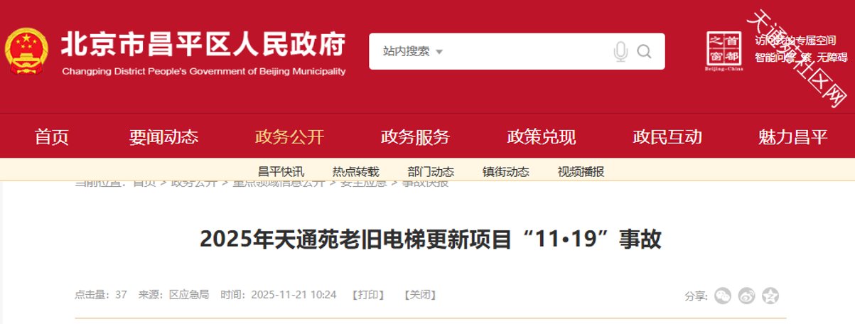 19日,北京天通苑老旧电梯更新项目发生一起事故