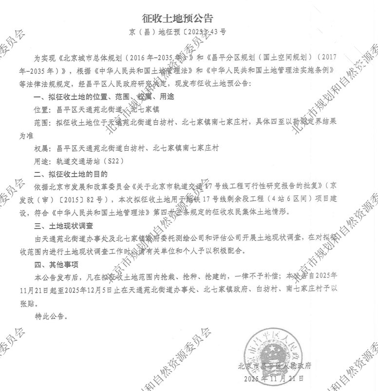 据了解,本次征地所依据的是北京市发改委对轨道交通17号线工程的可行性批复。地铁17号线作为一条贯穿京城南北的“大站快线”,其剩余段(4站6区间)的建成通车,对于连接未来科学城、天通苑、望京等重要城市功能区,提升沿线居民公共交通出行效率具有至关重要的意义。公告明确指出,该征地行为符合《土地管理法》第四十五条规定的为公共利益需要建设基础设施的征收情形。
