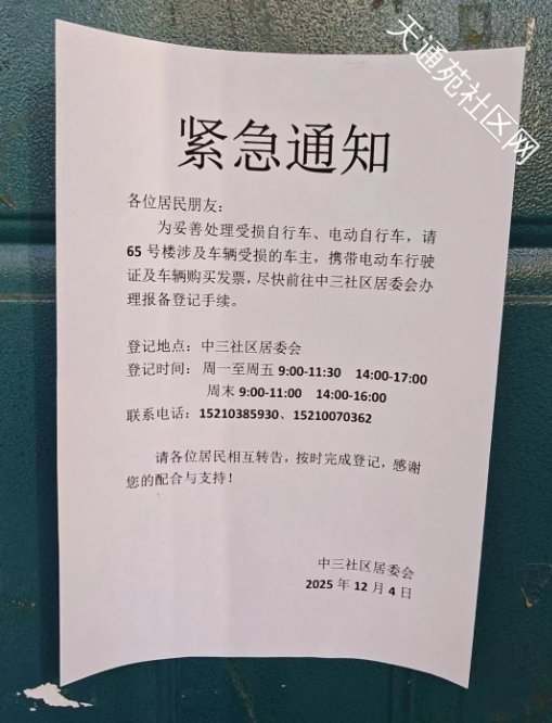 电动车无辜被殃及,怎么赔?记者采访了天通苑中三社区居委会,对方表示,为妥善处理受损自行车、电动自行车,社区正在开展财产损失统计工作,“相关车主携带电动车行驶证及车辆购买发票,前往中三社区居委会办理报备登记手续即可。后续理赔,需要等定损等结果出来之后才能明晰。”