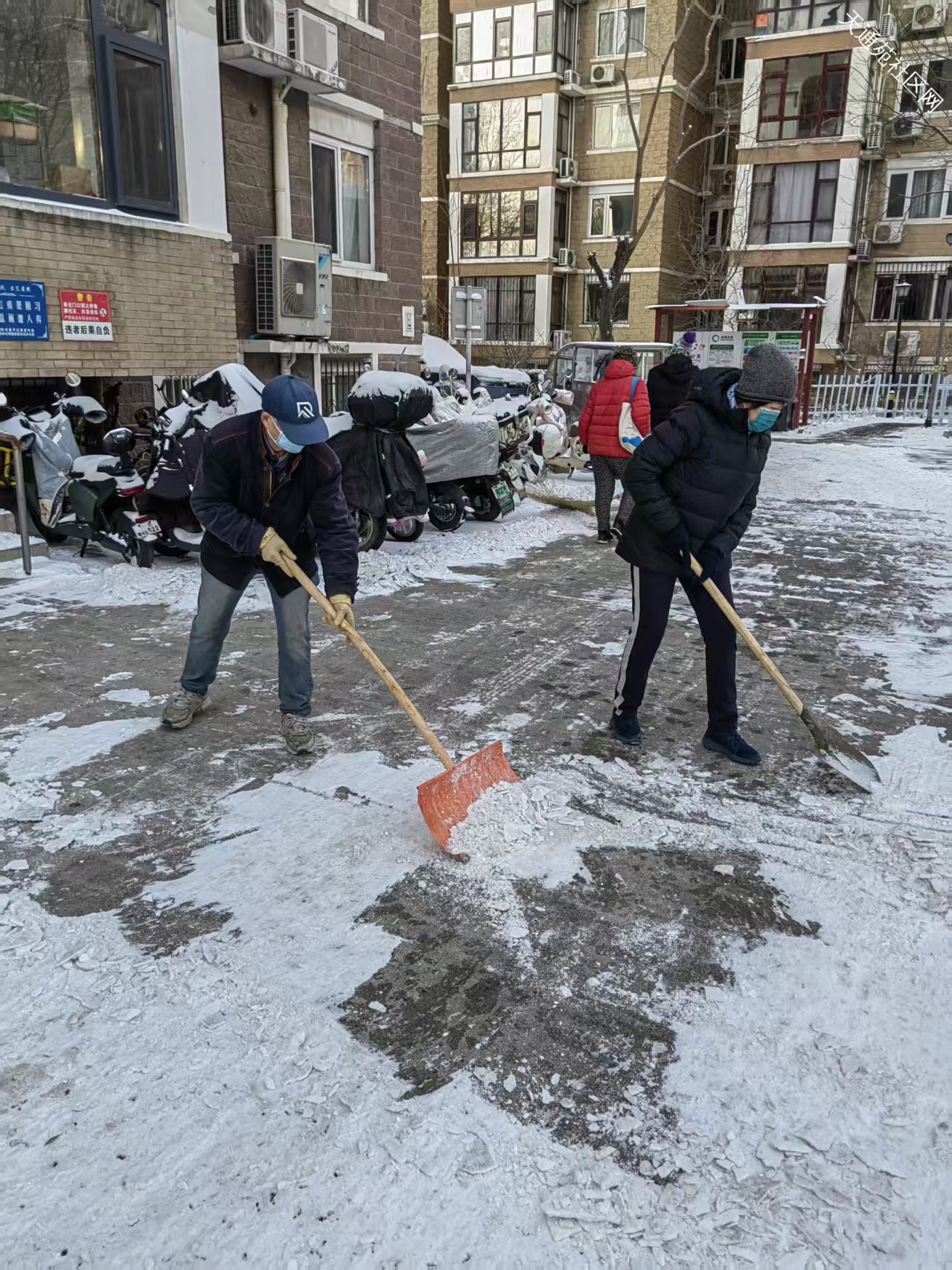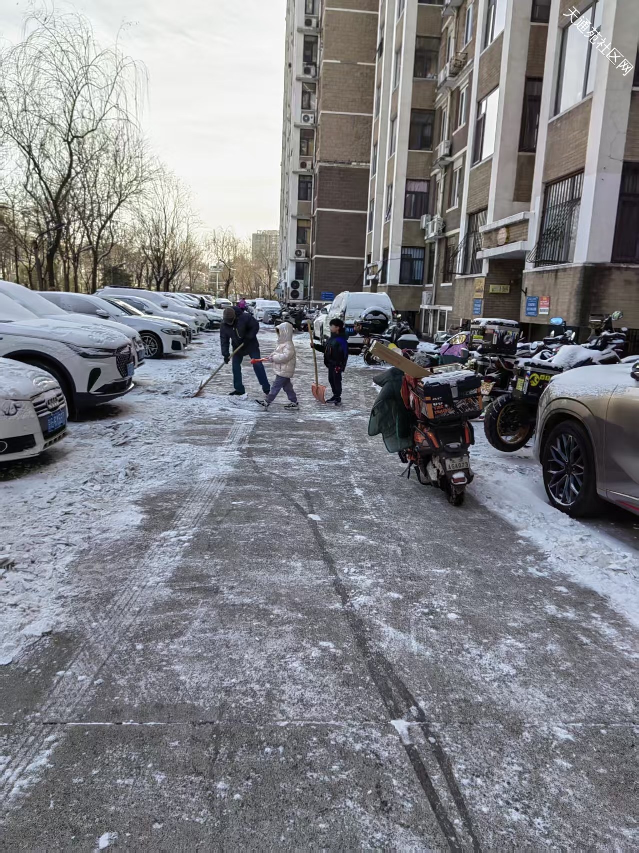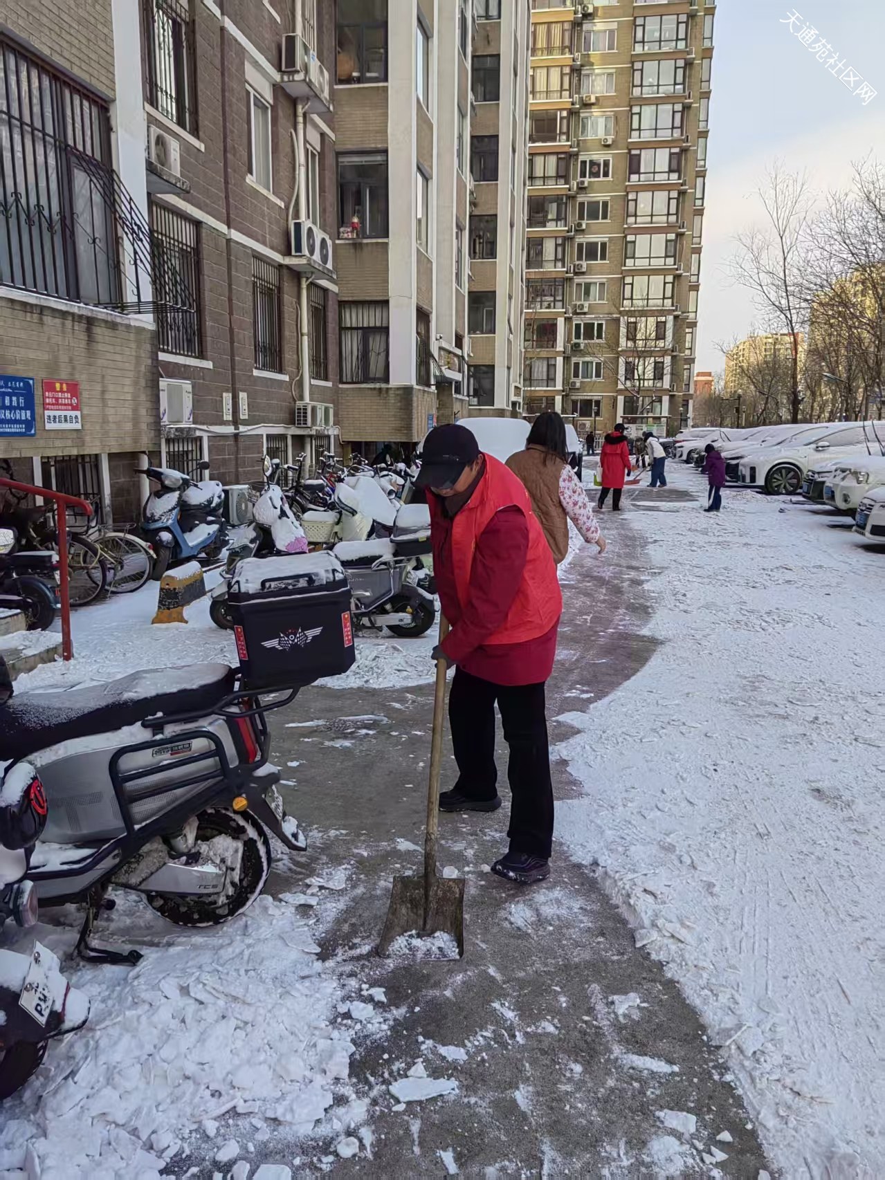 提前准备工具,雪后招呼住户一起扫雪也算亡羊补牢。