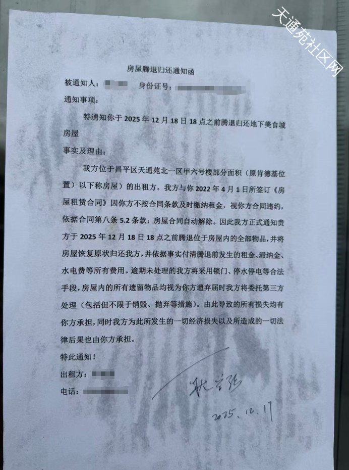 天通苑地铁站天桥下边蜜雪冰城被贴了拖欠房租公告,周末到今天也没营业。看公告内容还涉及地下一层美食城,好像是是一个老板承租的,今天看美食城也贴了通知,不知道被谁撕了,门口一堆沙子,进去感觉像是要装修,开是开着没啥人,没付租金要被房东收回房屋了这是?