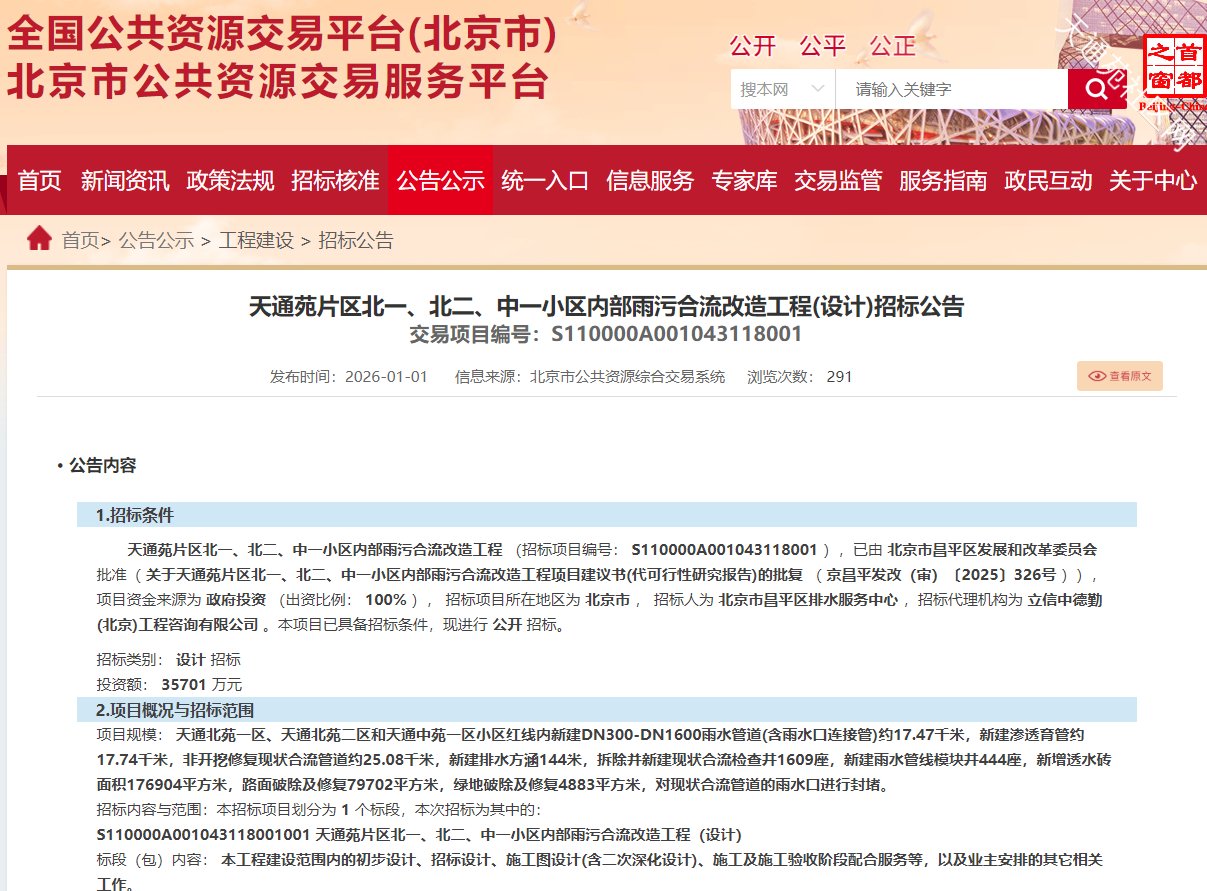 天通苑片区北一、北二、中一小区内部雨污合流改造工程 (招标项目编号: S110000A001043118001 ),已由 北京市昌平区发展和改革委员会 批准( 关于天通苑片区北一、北二、中一小区内部雨污合流改造工程项目建议书(代可行性研究报告)的批复 ( 京昌平发改(审)〔2025〕326号 )),项目资金来源为 政府投资 (出资比例: 100% ), 招标项目所在地区为 北京市 , 招标人为 北京市昌平区排水服务中心 ,招标代理机构为 立信中德勤(北京)工程咨询有限公司 。本项目已具备招标条件,现进行 公开 招标。