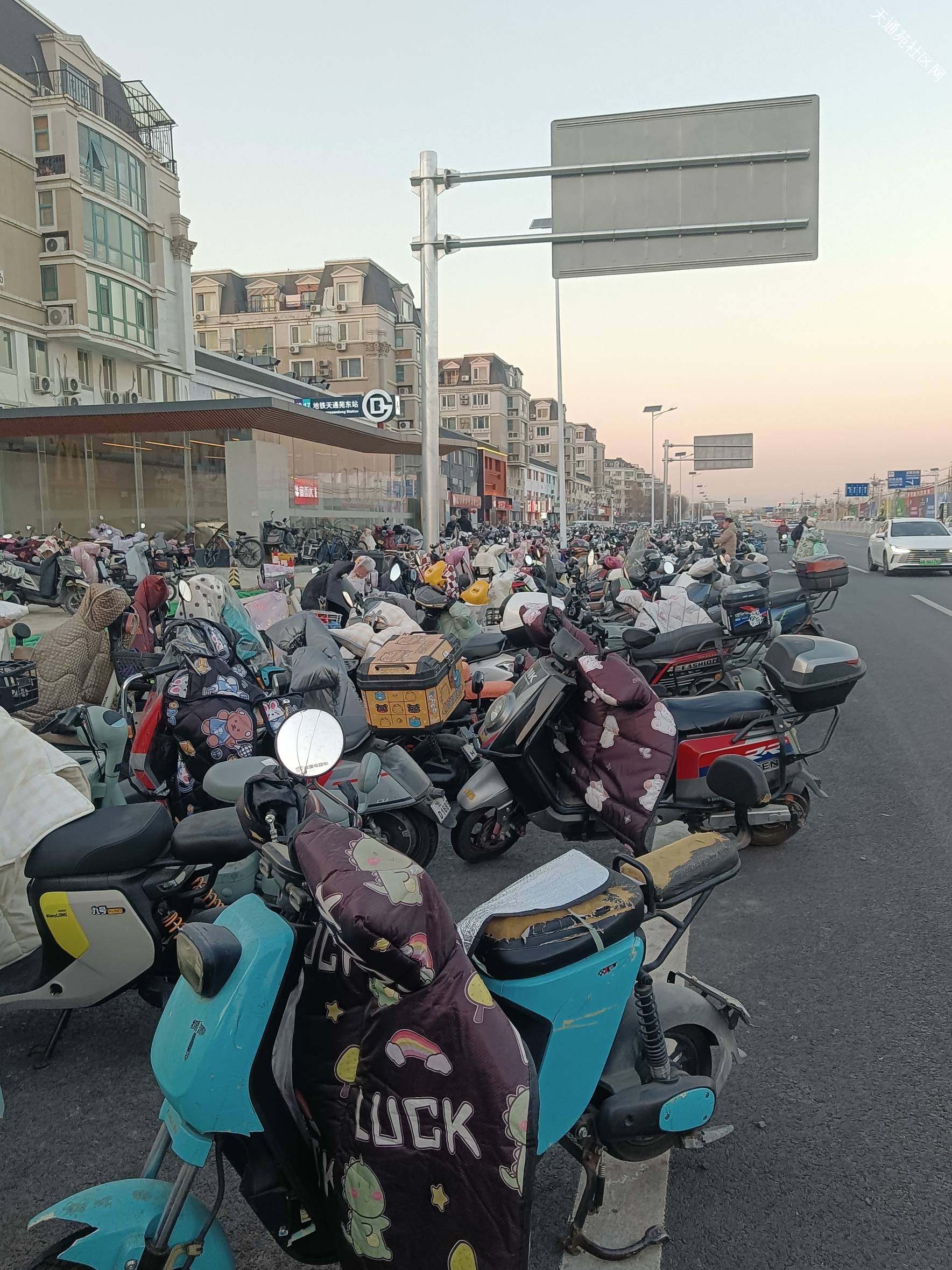 市区新建的地铁站有很多在狭窄道路两侧,没有拓展的空间,而天通苑在五环外,预留的绿化带较宽,对于非机动车停车难还是有一定的拓展空间的,尤其在天通苑东站周围还有未开发使用的地,为什么有空间解决问题还要让问题产生?这是一个值得深思的问题!希望地铁部门就市政部门能就这些问题及早协商解决!避免长期拖延造成无法改变的局面!