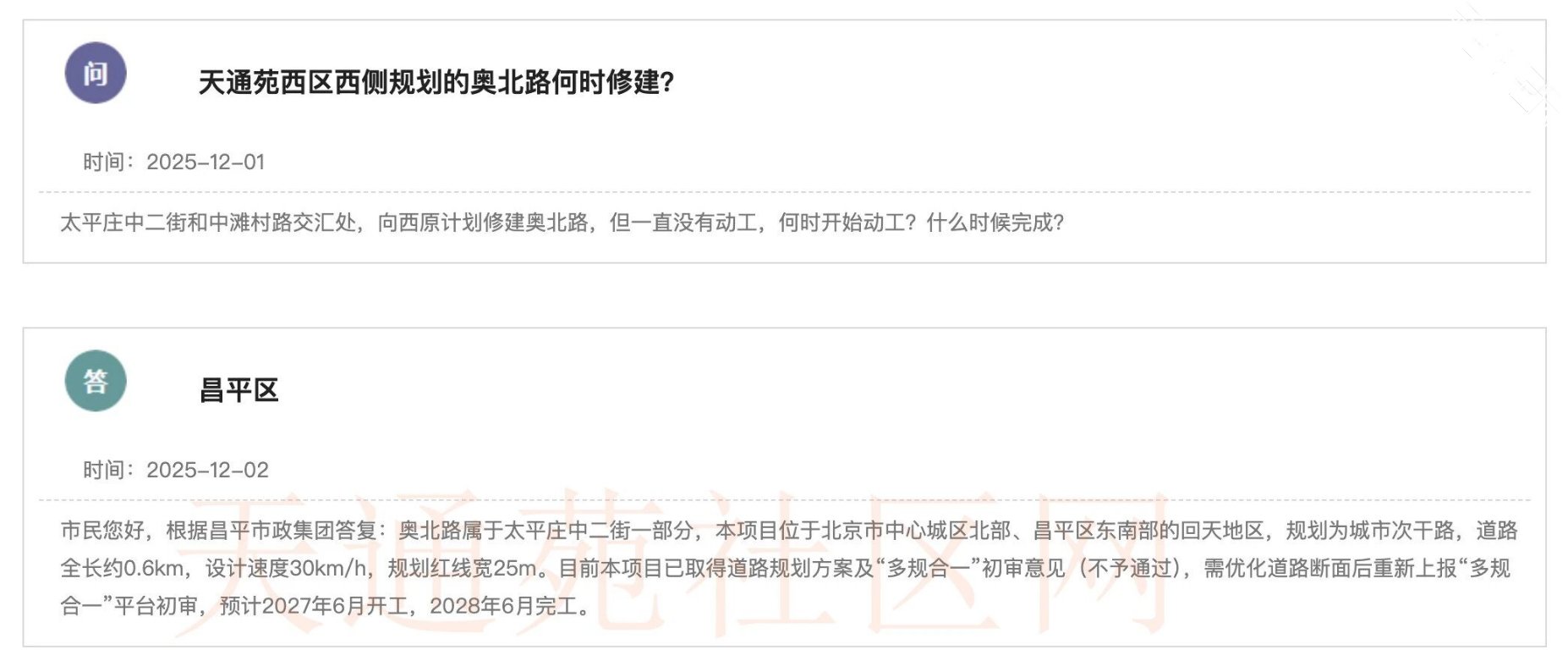 最新的官方回复来自昌平市政集团,相比此前的表述更为具体,也透露了项目推进中的关键阻碍:目前项目已取得道路规划方案,但“多规合一”初审未通过,核心原因是需要优化道路断面,优化后将重新上报初审。最终预计2027年6月开工,2028年6月完工,规划红线宽度从35米调整为25米。