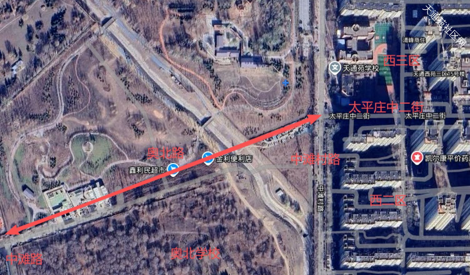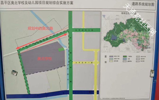 @Tiantian向上下图篮框内为奥北中学,红色箭头是规划的奥北路