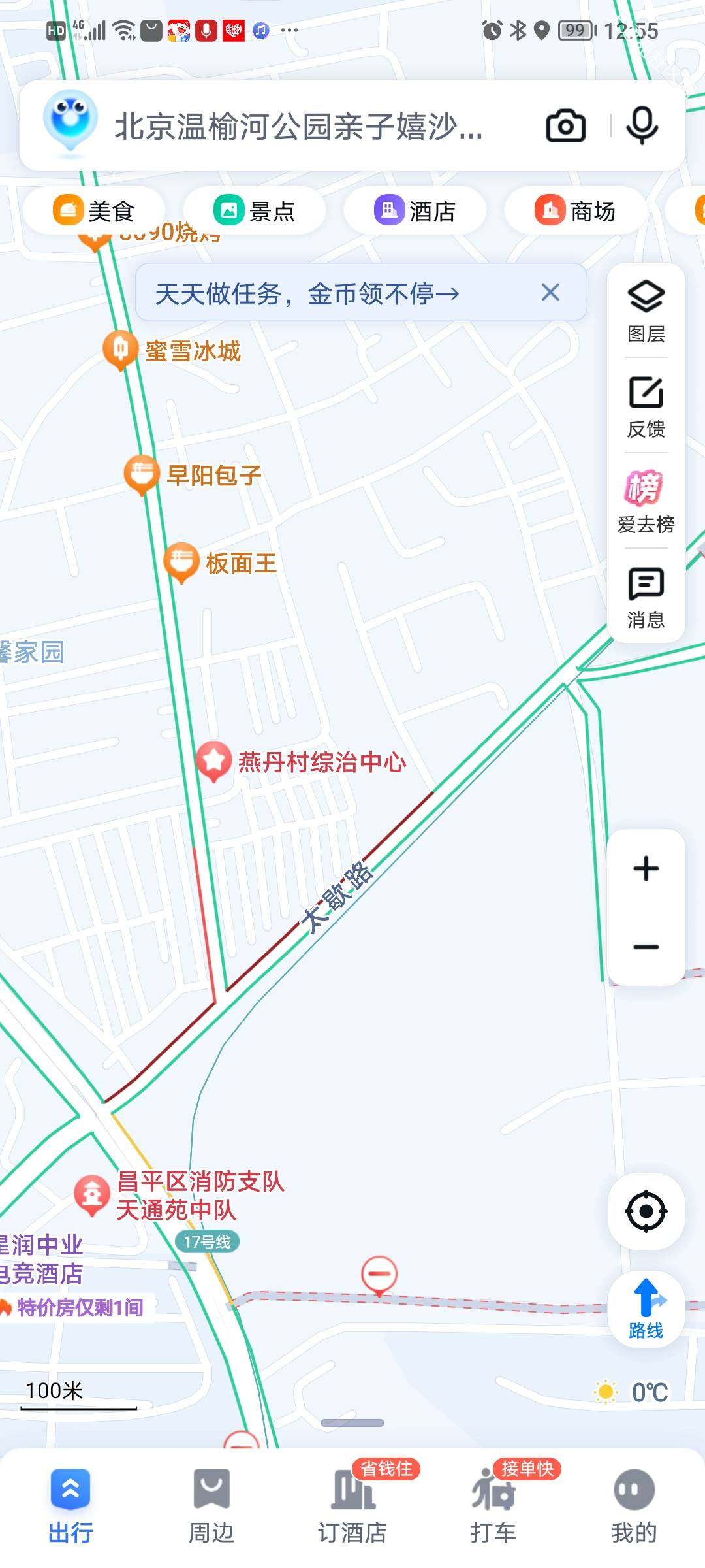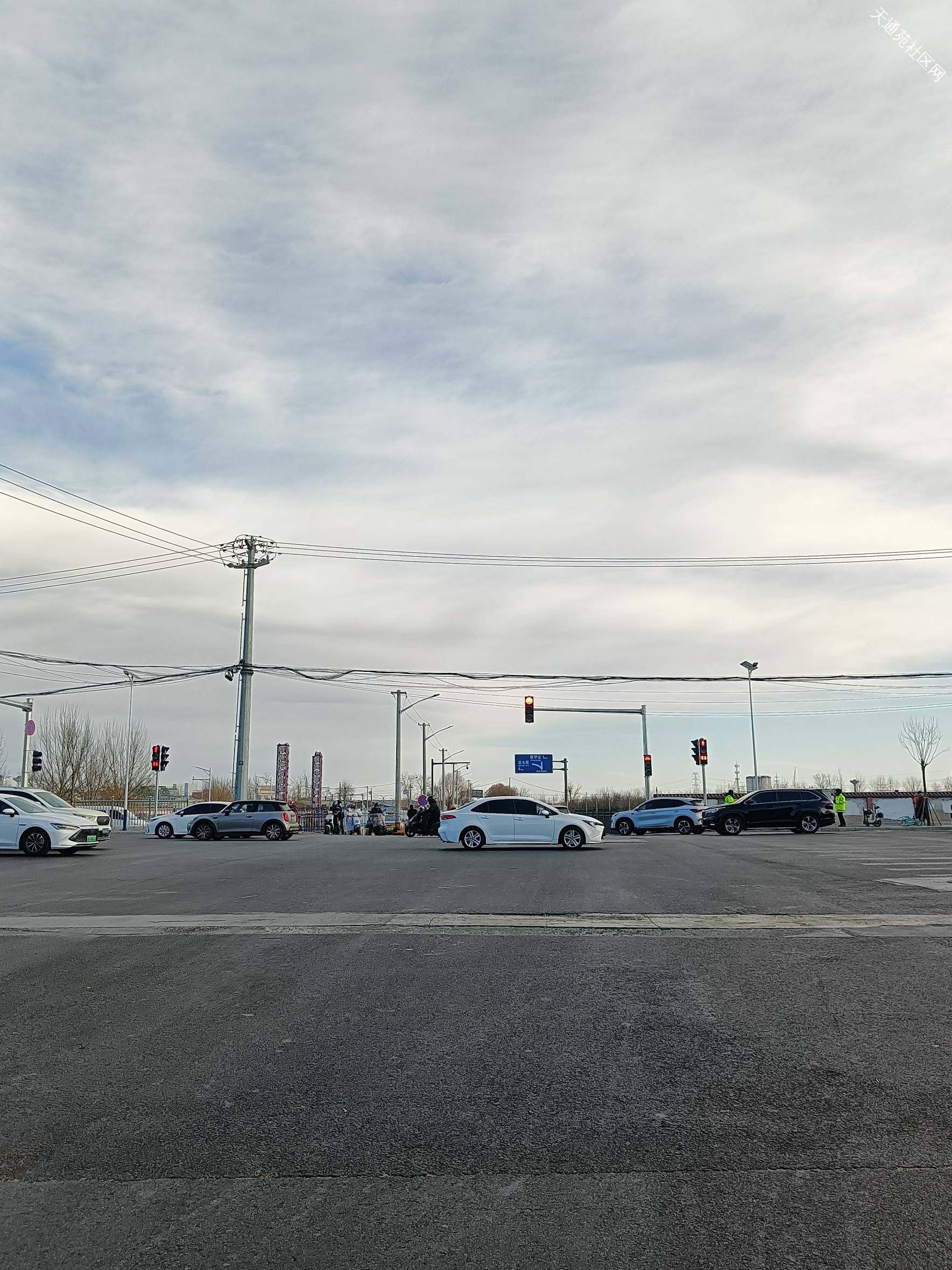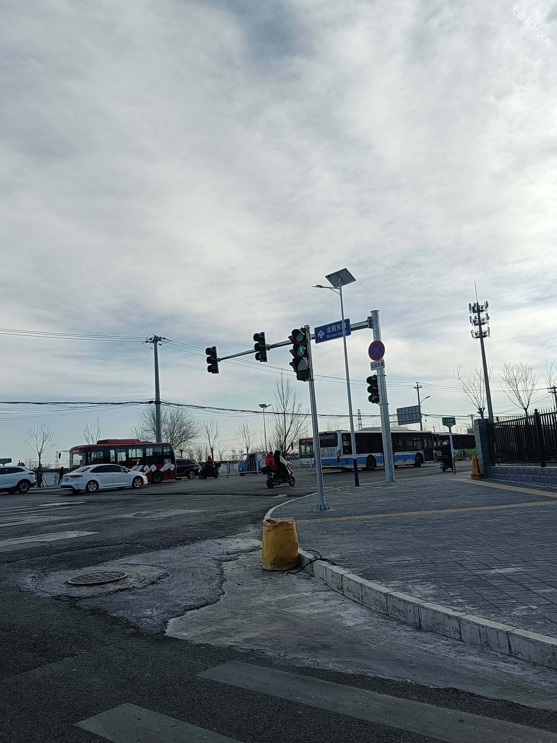 燕丹村东侧路段情况,今天有大风,路上机动车和行人少了很多,仍然拥堵