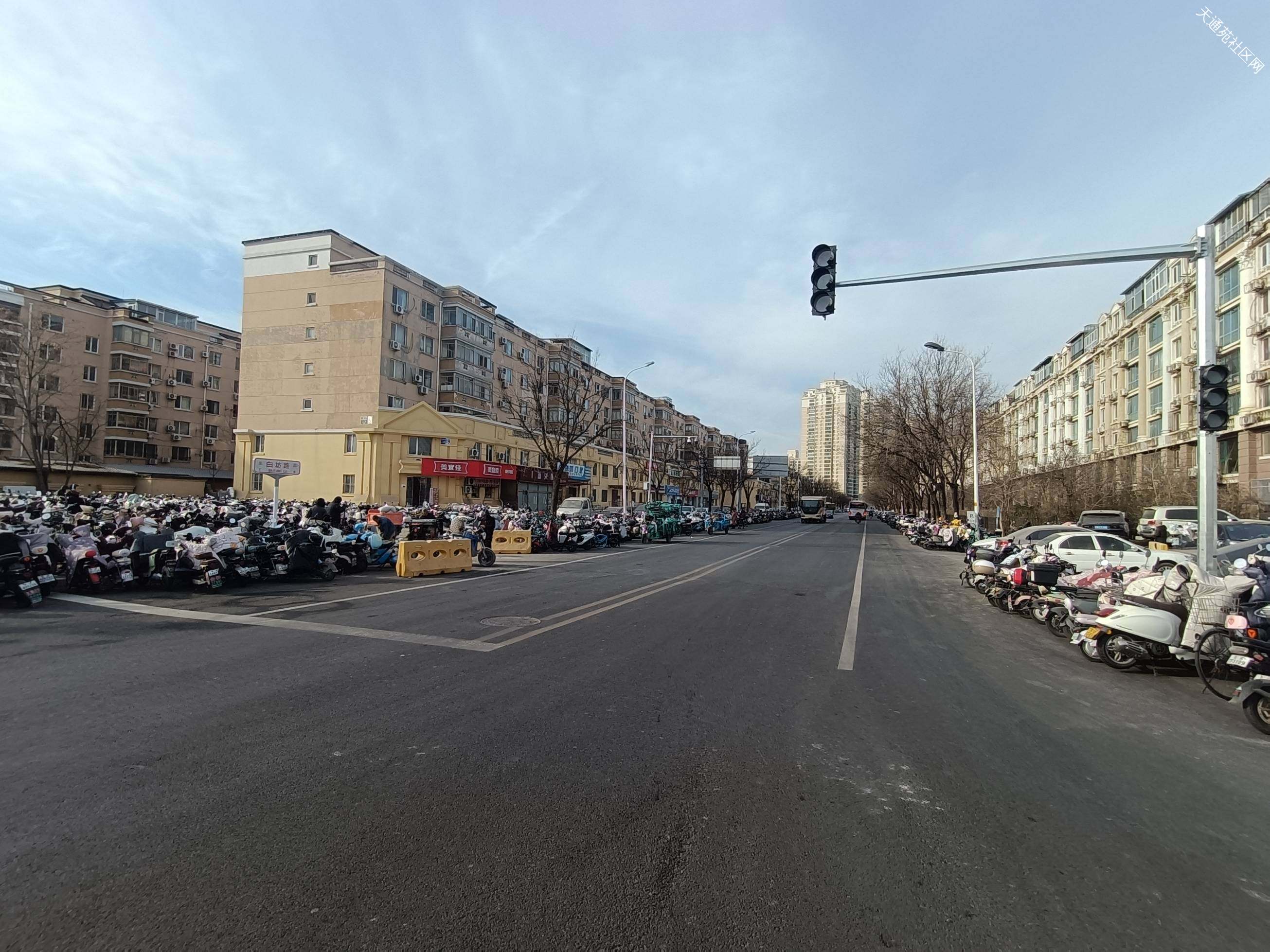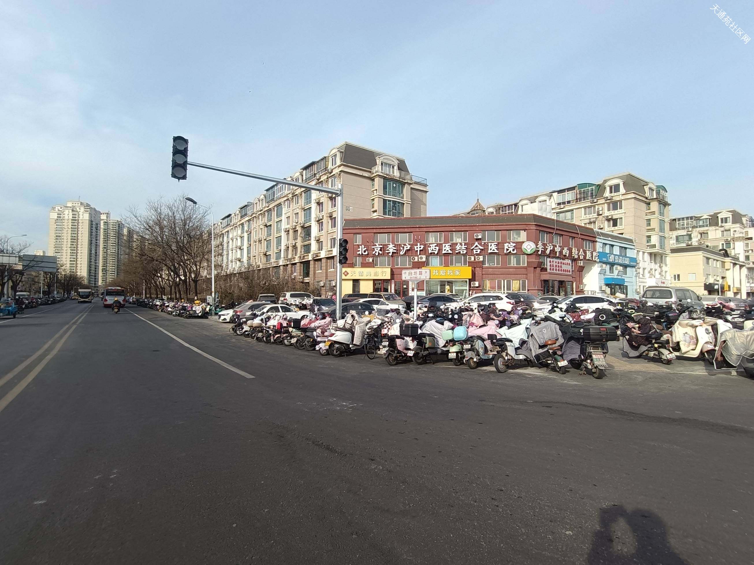 天通苑东站十字路口向北(A口)方向,一眼望不到头,非机动车道也停满了非机动车。