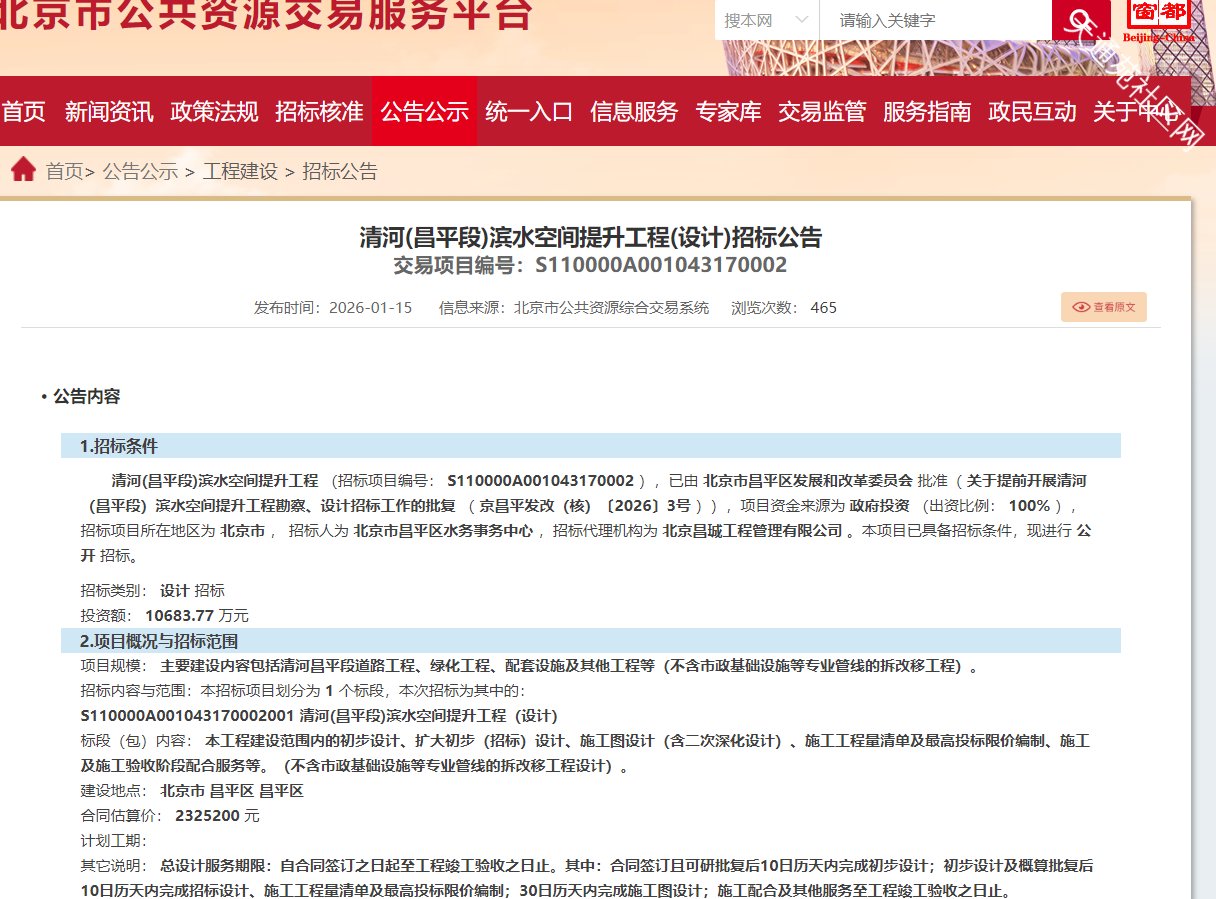 清河(昌平段)滨水空间提升工程(设计)招标公告