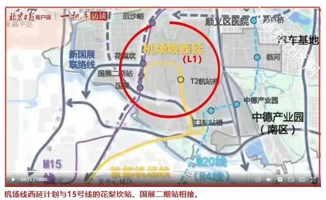 此前,北京日报客户端“一把手”访谈披露的《顺义区平原新城高质量发展实施方案(2025年-2030年)》中,就深入研究和推进机场线(L1线)西延,将与花梨坎站、国展二期站地铁相接,进一步完善城市轨道交通网络布局,更将助力新国展区域实现更高质量发展,提升区域综合竞争力与城市服务功能。其中,国展二期站不是既有站点,而是花梨坎与国展站之间即将新增的站点,即15号线新国展地区加站位置。