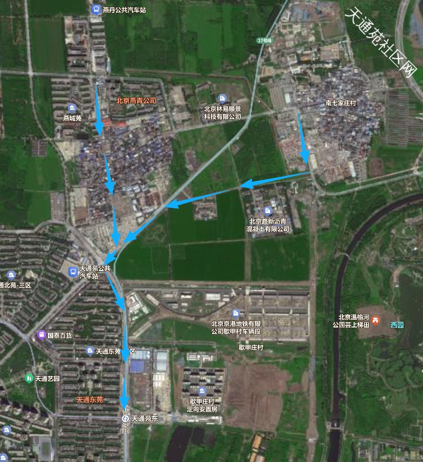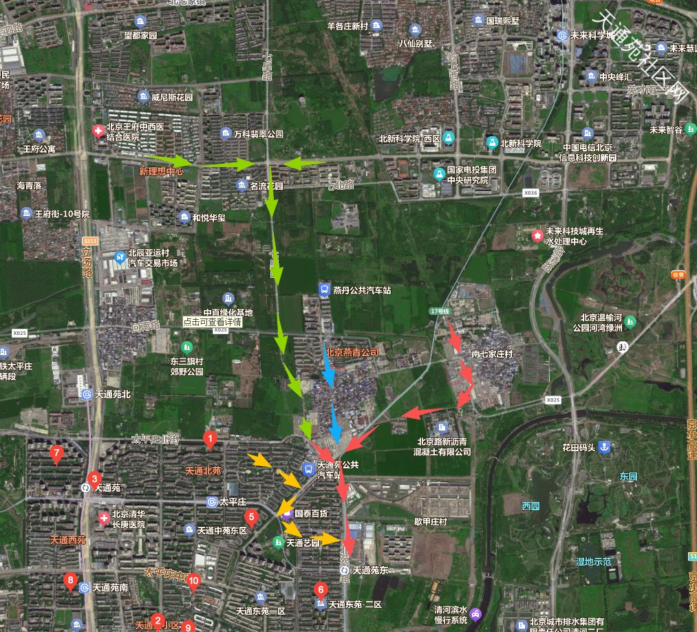 根据观察,来往天通苑东地铁站的非机动车,大都来自燕丹存、北七家、南七家、天通苑北三区等,见下图示意。