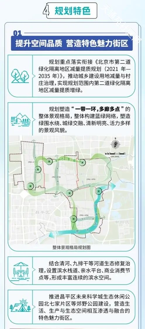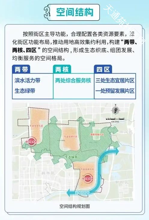 根据规划,北七家南部组团将构建“两带、两核、四区”的空间结构。在空间品质提升方面,该区域将重点推进清河等河道生态修复治理、建设高品质滨水空间与郊野公园,勾勒出城绿交融、活力多元的景观风貌,让生态成为区域发展的“底色”。