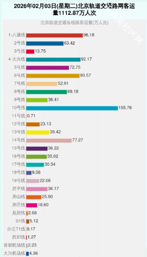 2026年2月2日,17号线当日客运量达30.31w人次,创历史新高,这一切都要归功于1月31日17号线望京西站的开通,为17号线带来大量通勤客流 与上周一(1月26日)进行同期对比,17号线客流量直接暴涨5w人次,待客流进一步培养后,17号线客流量超过16号线已经是大势所趋;同时可发现,5号线、10号线、14号线的客流量均有1w-2w人次的下滑趋势,间接印证了17号线的分流效果 同时对望京西开通当日(1月31日)的客流量进行考察,17号线作为刚贯通运营一个月的新线路,双休日客流量达到22.27w人次,直接超越了15号线、16号线,甚至超过了老牌线路13号线。