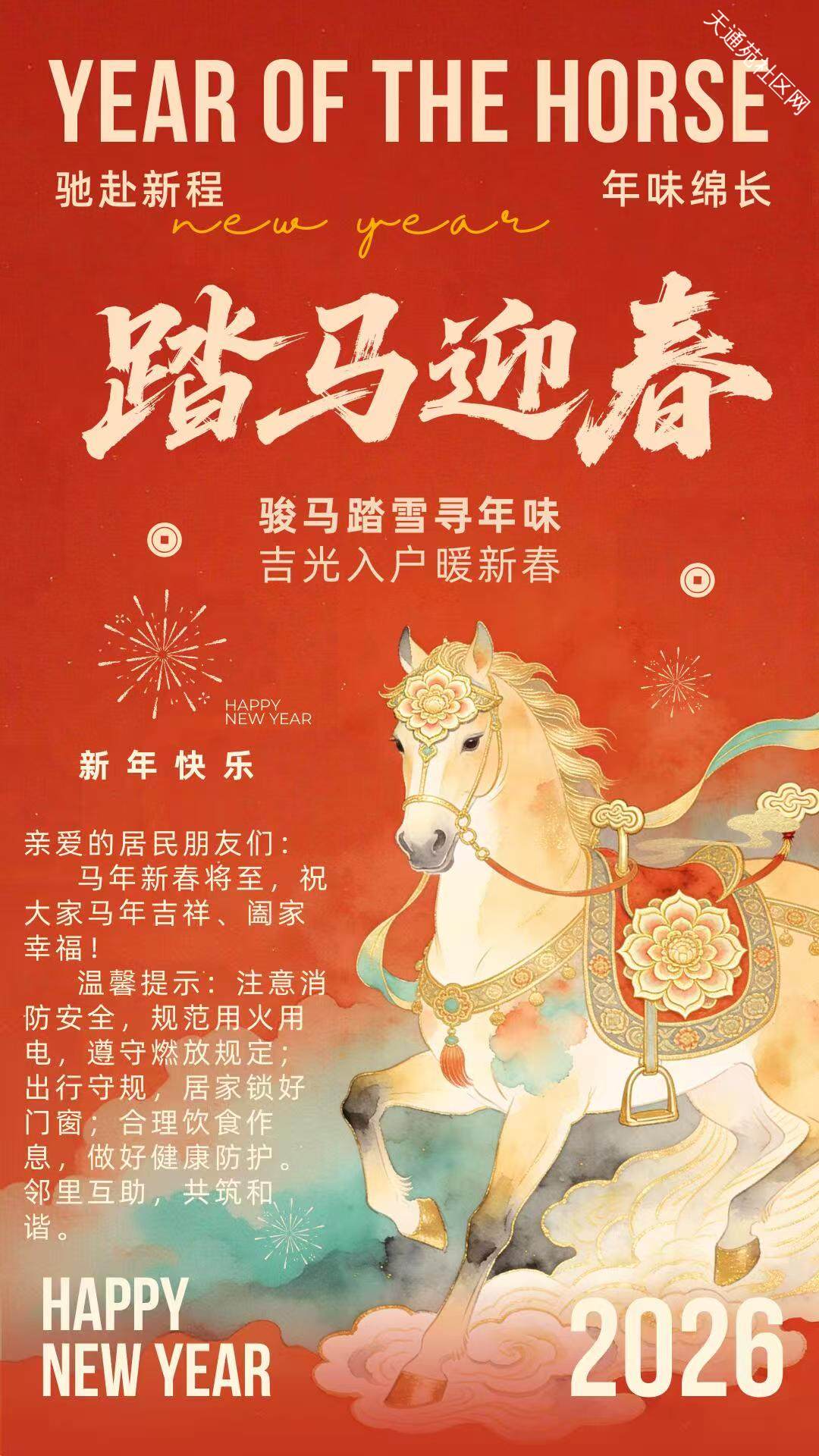 金马迎春,新春佳节将至,天通苑物业公司谨向广大业主致以诚挚的节日问候,