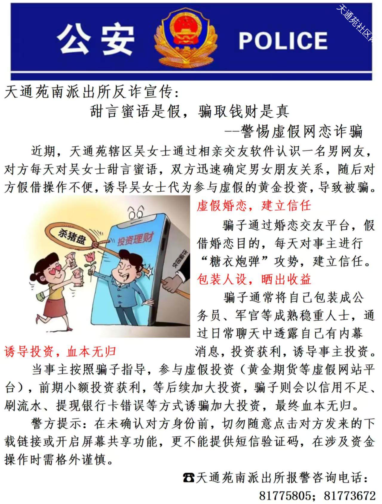 天通苑南派出所反诈宣传: 甜言蜜语是假,骗取钱财是真一-警惕虚假网恋诈骗