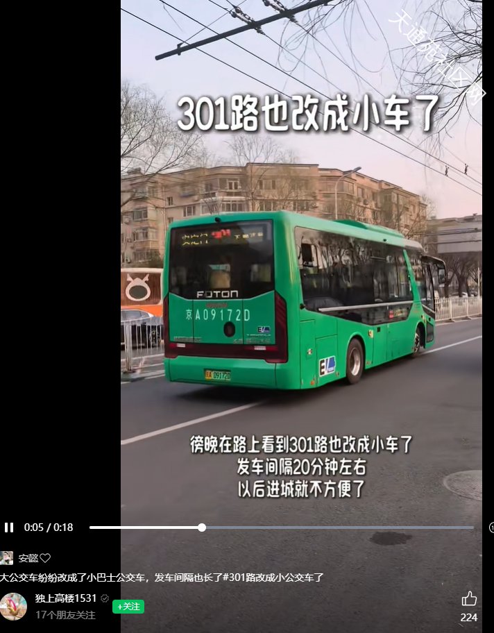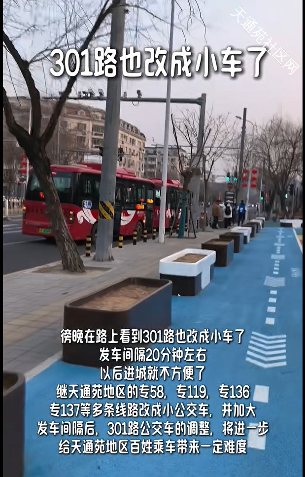 刷到的,听说301路公交改小车了,是真的吗?公交集团你看看,天通苑这么多人,小车合适吗?间隔还加大