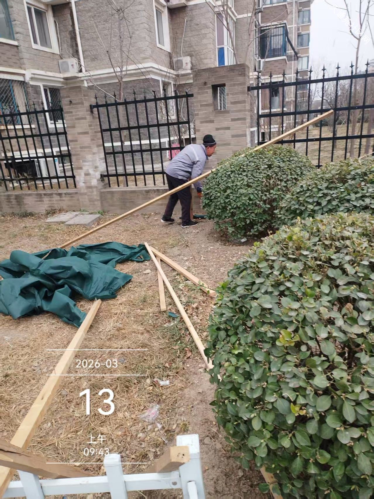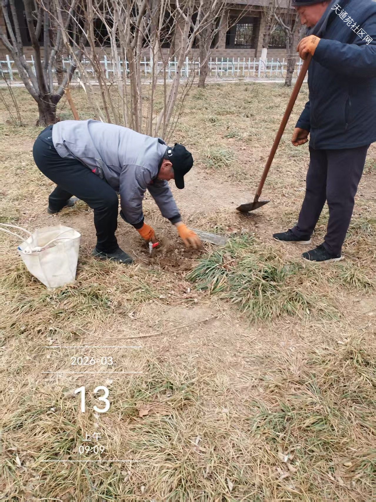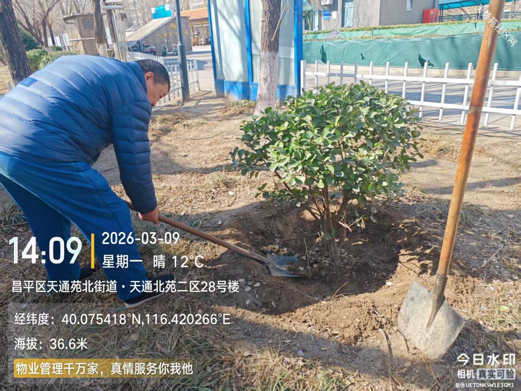 北区保洁绿化分队,随着春季气温不断升高,小区绿化全面启动,清理绿化垃圾、拆防寒、中水管线检修、打水盆、修围堰为浇灌返青水做好准备工作。