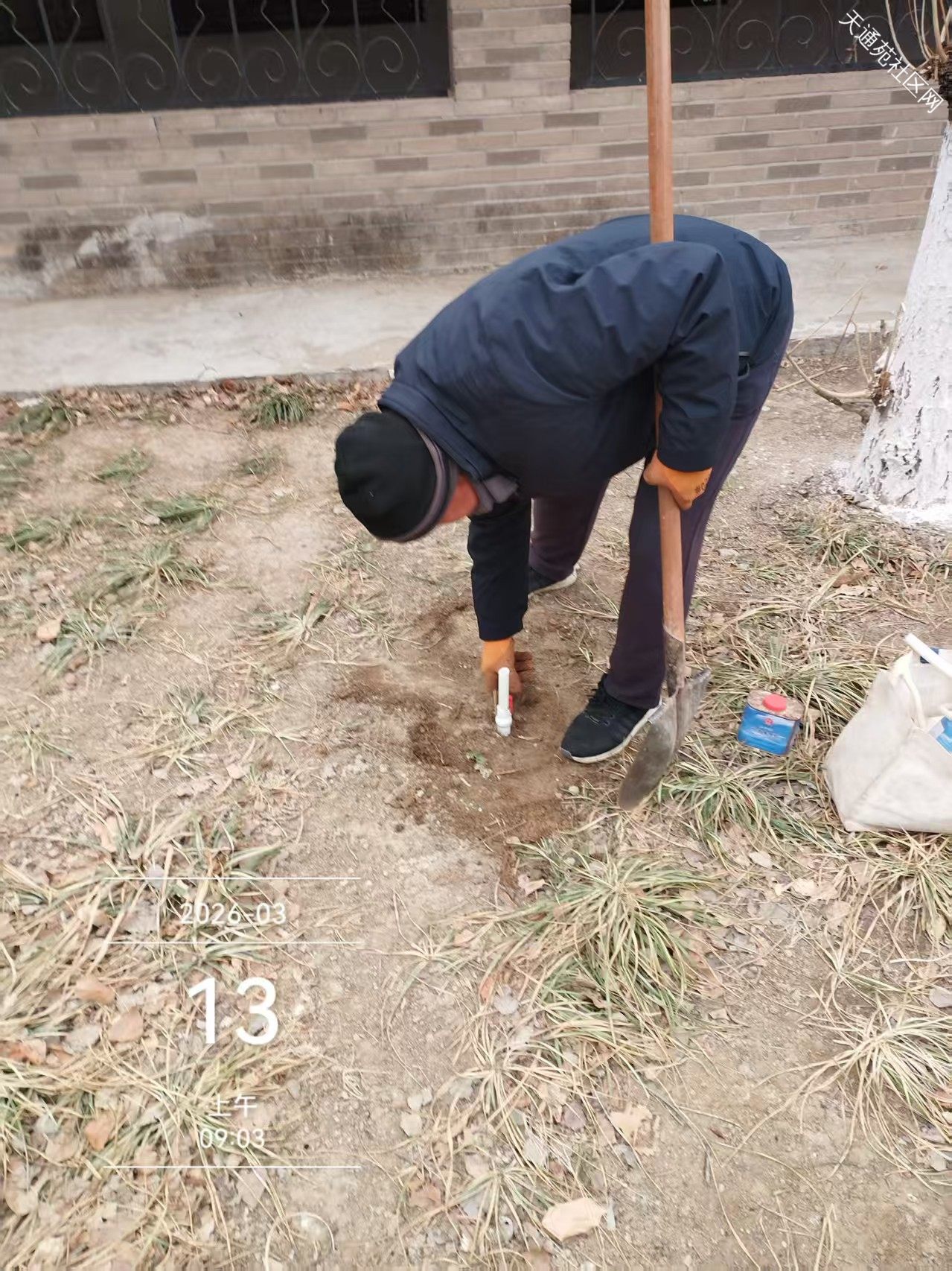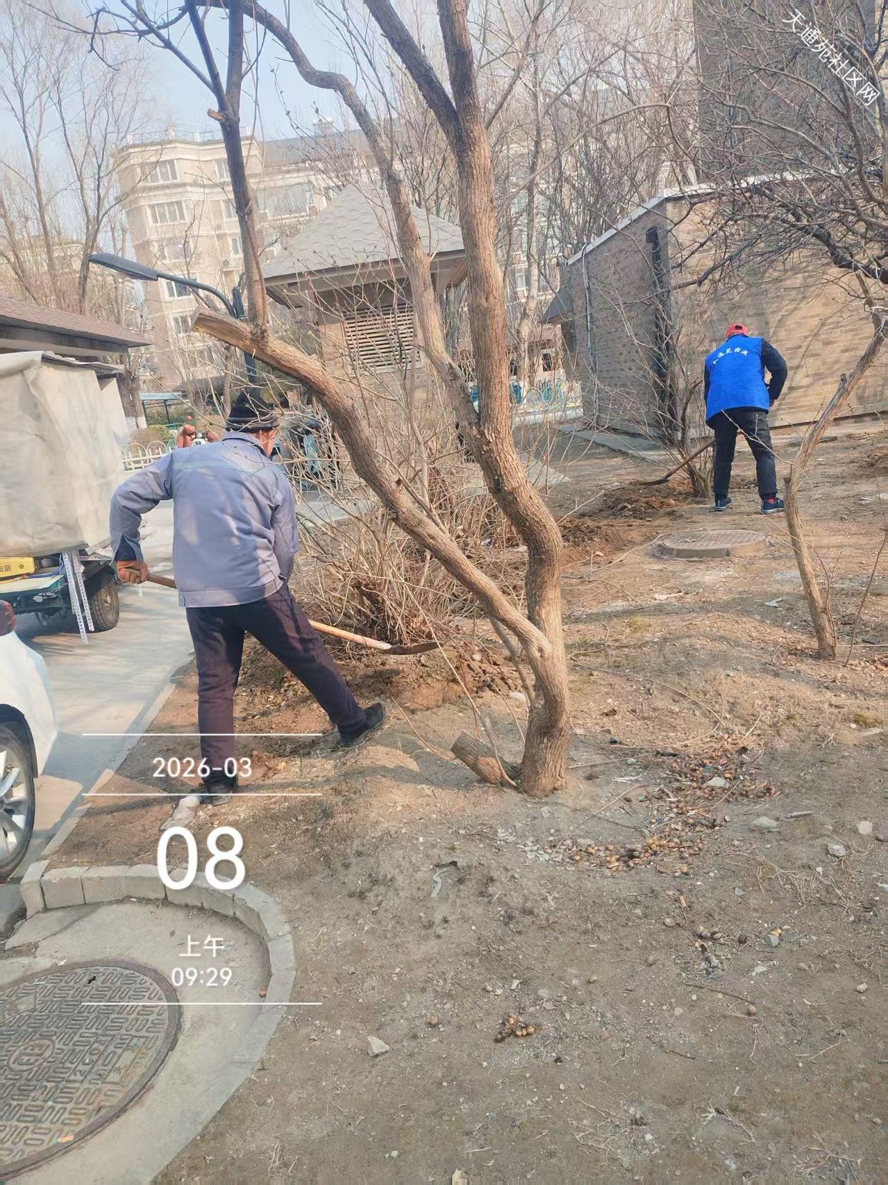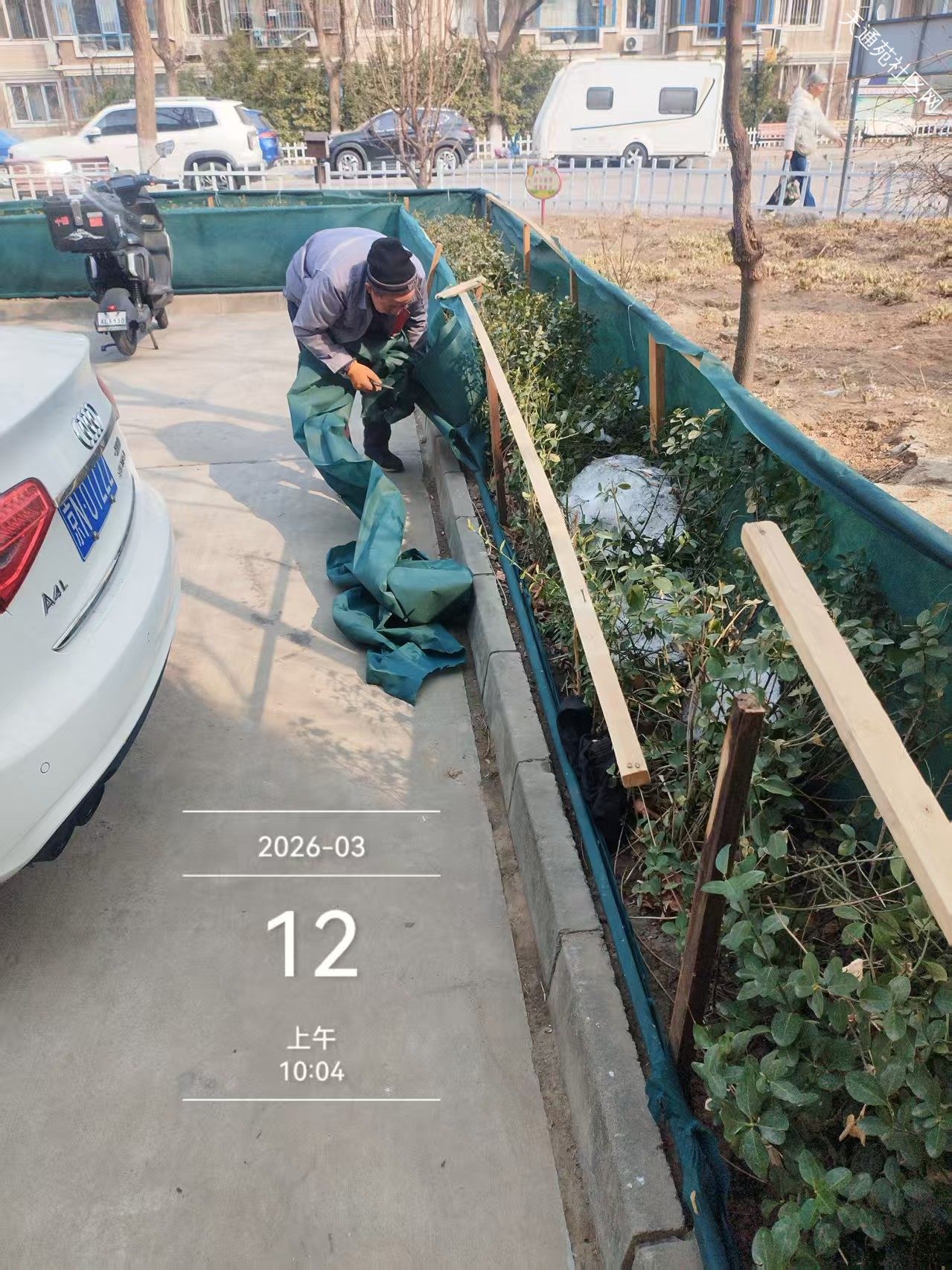 北区保洁绿化分队,随着春季气温不断升高,小区绿化全面启动,清理绿化垃圾、拆防寒、中水管线检修、打水盆、修围堰为浇灌返青水做好准备工作。