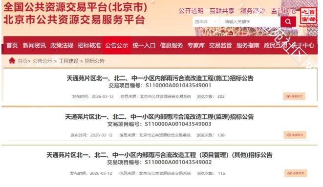 天通苑片区北一、北二、中一小区内部雨污合流改造工程 (招标项目编号: S110000A001043549001 ),已由 北京市昌平区发展和改革委员会 批准( 关于天通苑片区北一、北二、中一小区内部雨污合流改造工程初步设计概算的批复 ( 京昌平发改(审)〔2026〕37号 )),项目资金来源为 政府投资 (出资比例: 100% ), 招标项目所在地区为 北京市 , 招标人为 北京市昌平区排水服务中心 ,招标代理机构为 立信中德勤(北京)工程咨询有限公司 。本项目已具备招标条件,现进行 公开 招标。